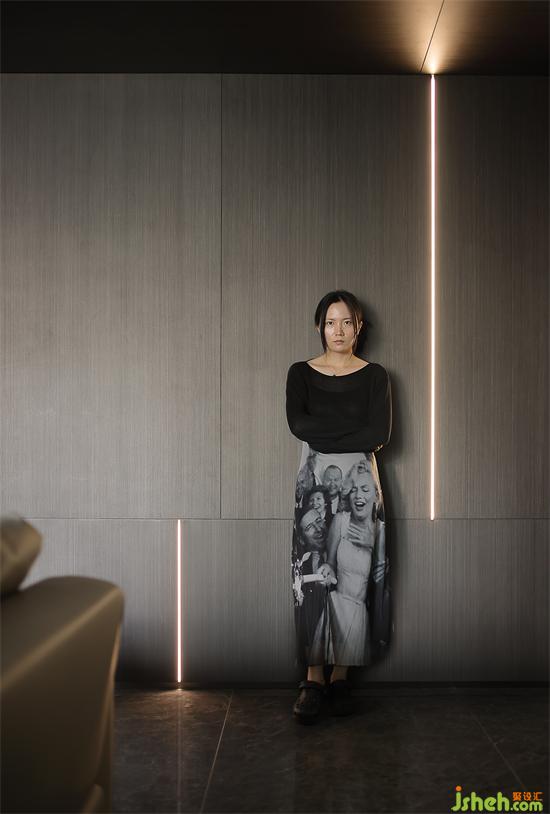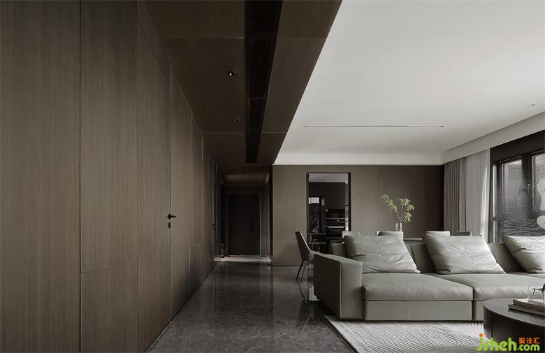 木飾面拼接隨意,內(nèi)嵌燈條展示出錯落的高級感,這樣的線條也讓門洞更加隱性。