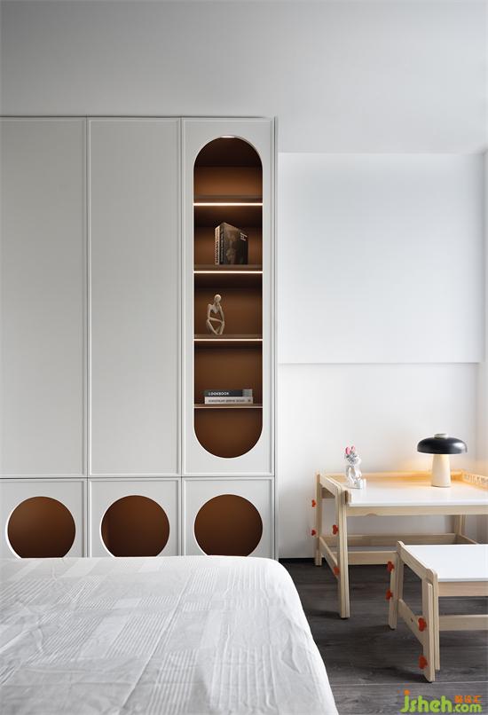 衣柜造型童趣十足,柜門打造柔和弧形,開(kāi)放格加以燈帶點(diǎn)綴,夢(mèng)幻滿滿??看皵[放兒童桌椅,小巧可愛(ài)。