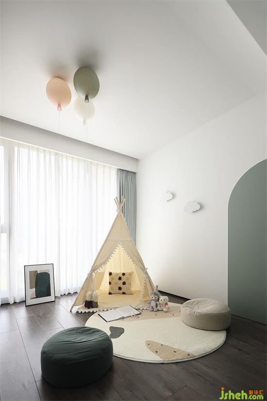 單獨(dú)一間臥室打造成孩子娛樂(lè)玩耍的空間,隨著孩子的成長(zhǎng),后期再做調(diào)整。整體家裝設(shè)計(jì)簡(jiǎn)約且夢(mèng)幻,燈具如氣球漂浮在上方,搭配清新馬卡龍色系,如城堡般令人向往。