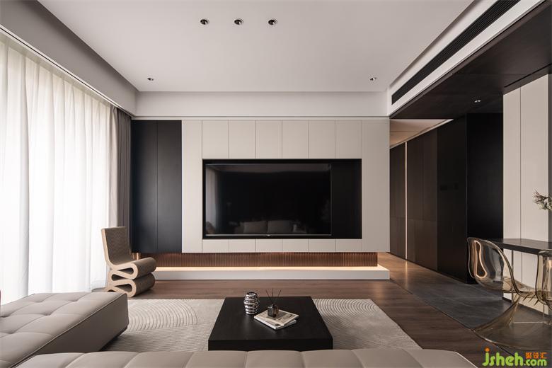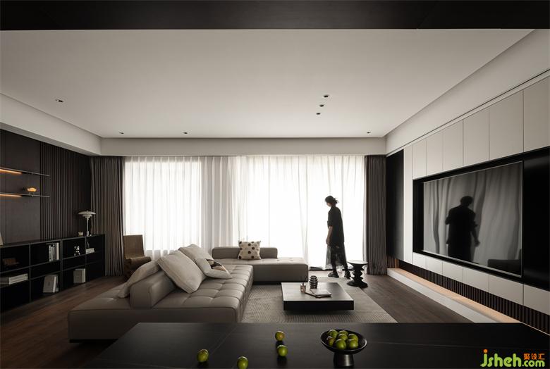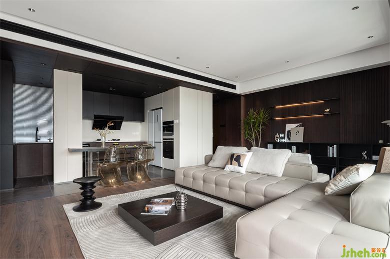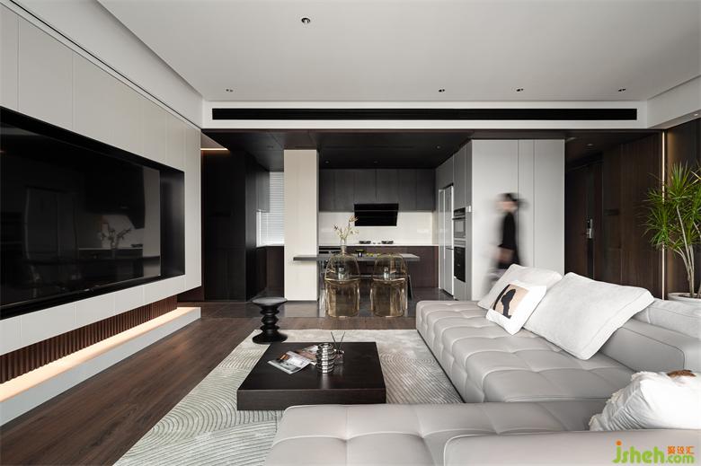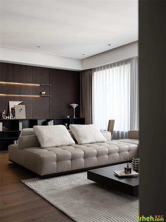 大平頂無(wú)主燈設(shè)計(jì)清爽無(wú)比,四周懸空輕盈立體,黑白灰在空間中碰撞出經(jīng)典與高級(jí),家裝設(shè)計(jì)搭配質(zhì)感豐富的深色木材,以及不同材質(zhì)的飾面板,空間流暢且大氣。