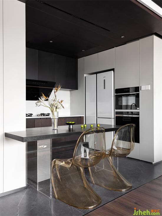 餐桌倚靠梁體,與廚房形成洄游動(dòng)線,使用過程更加便捷,櫥柜深淺不一,再次強(qiáng)調(diào)黑白灰的對(duì)比,與客廳形成呼應(yīng),自然且和諧。