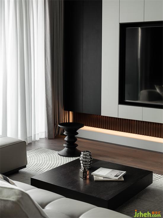 平衡的色調(diào)也是臺(tái)式風(fēng)格的一種表現(xiàn)手法,茶幾、邊幾和電視柜,同種啞光黑質(zhì)感,搭配灰色沙發(fā)和地毯,家裝設(shè)計(jì)黑白灰在空間中形成強(qiáng)烈對(duì)比,沒有濃烈的色彩,由此將高級(jí)感彰顯盡致。