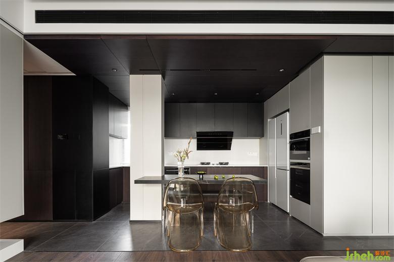 餐廚區(qū)域采用深色木材吊頂,與墻面質(zhì)感保持統(tǒng)一,家裝設(shè)計(jì)豐富空間層次,地面采用灰黑色瓷磚,與客廳地板自然分隔,極窄收口條自然過渡,簡(jiǎn)約大氣。