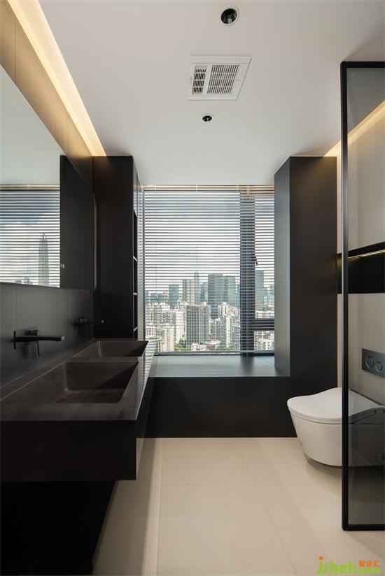 保留主衛(wèi)的飄窗部分,家裝設(shè)計(jì)采用防潮防水的飾面板包裹,呈現(xiàn)輕奢高級(jí)質(zhì)感。懸空雙臺(tái)盆搭配入墻水龍頭,盡展極簡(jiǎn)美學(xué)。