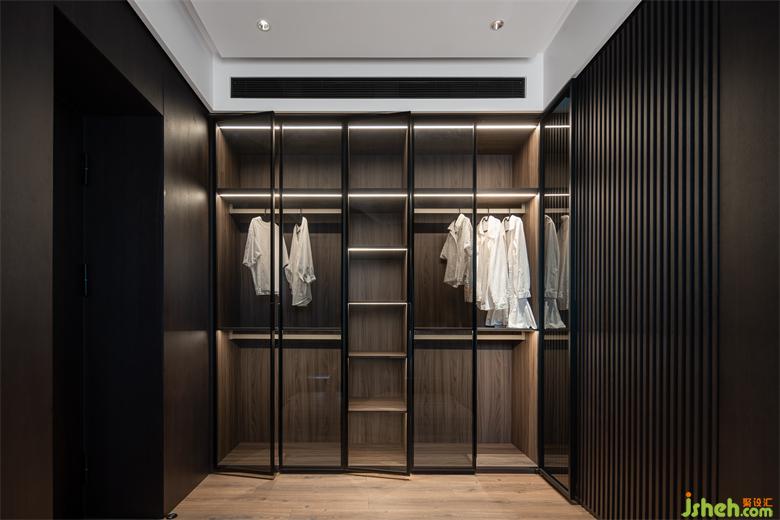 部分衣柜采用玻璃柜門(mén),放置一些常穿衣物一目了然,內(nèi)嵌燈帶氛圍滿(mǎn)滿(mǎn),作為展示區(qū)也是不錯(cuò)的選擇,家裝設(shè)計(jì)增強(qiáng)衣帽間的功能性與靈動(dòng)感。