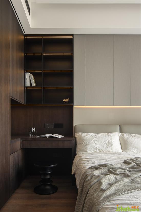 從衣柜中延伸出床頭柜區(qū)域,家裝設(shè)計(jì)還能充當(dāng)小書(shū)桌與梳妝臺(tái)使用,小空間實(shí)現(xiàn)大功能,層層開(kāi)放格搭配燈帶,書(shū)柜功能區(qū)也是臥室氛圍感來(lái)源。