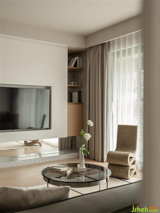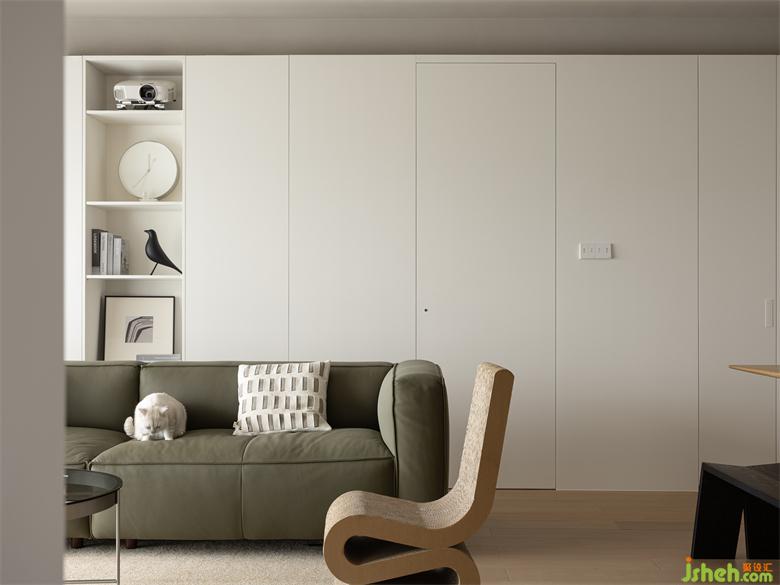 儲(chǔ)物柜中穿插開(kāi)放格,收納書(shū)籍或是作為展示柜,是沙發(fā)背景的點(diǎn)綴,亦能提供豐富多變的儲(chǔ)物方式。