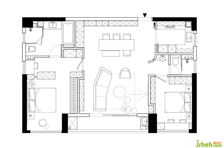 #1.非常罕見(jiàn)的對(duì)稱式戶型,空間利用率極高,改造空間很足,戶型缺點(diǎn)也很明顯,南北不通透,流動(dòng)性較差;
