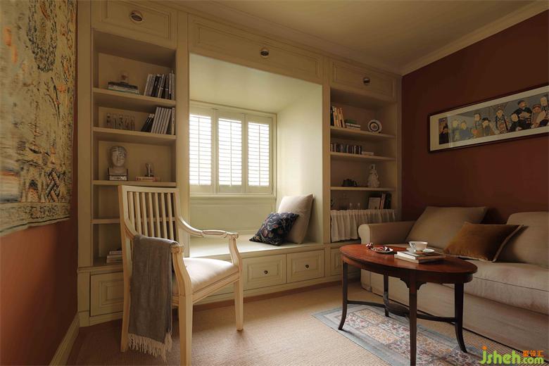 飄窗的設(shè)計(jì)是整個書房的亮點(diǎn),原本突兀的飄窗在英式風(fēng)里稍顯違和,我們設(shè)計(jì)成書柜+卡座的形式,深圳金地翠堤灣家裝設(shè)計(jì)打造成一個閱讀角,氛圍瞬間輕松愜意,窗戶也特意改成百葉窗,彰顯英倫風(fēng)格的獨(dú)特復(fù)古感。