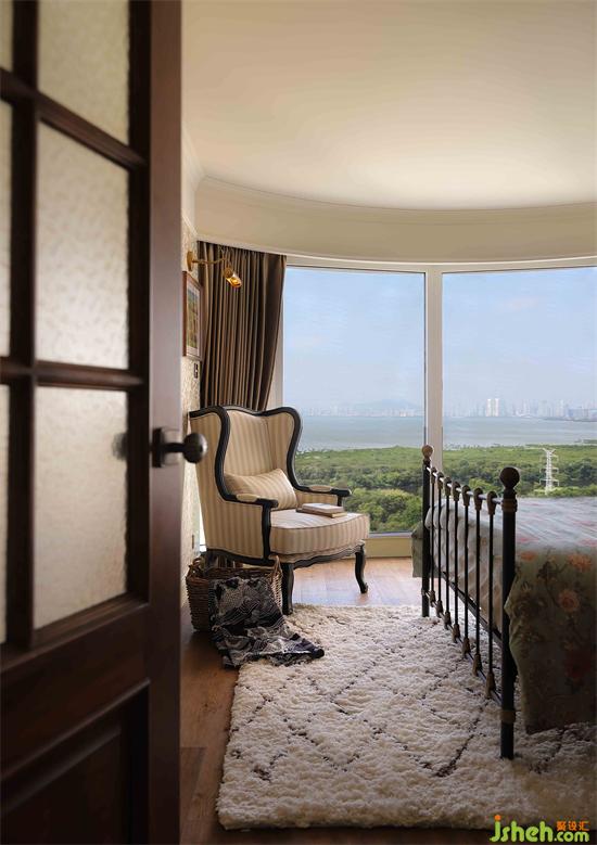 臥室門定制木材搭配壓花玻璃,細(xì)節(jié)到門把手,深圳金地翠堤灣家裝設(shè)計(jì)都是復(fù)古精致的款式,圓弧形落地窗盡攬綠樹海洋美景,拉開窗簾的那一刻,瞬間被大自然治愈。