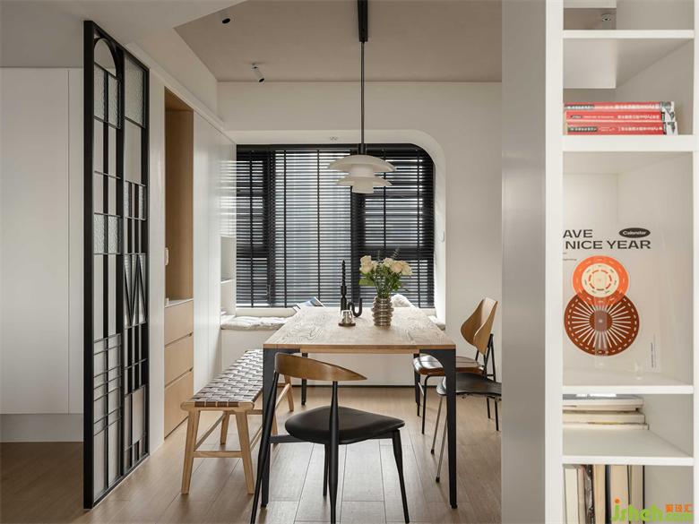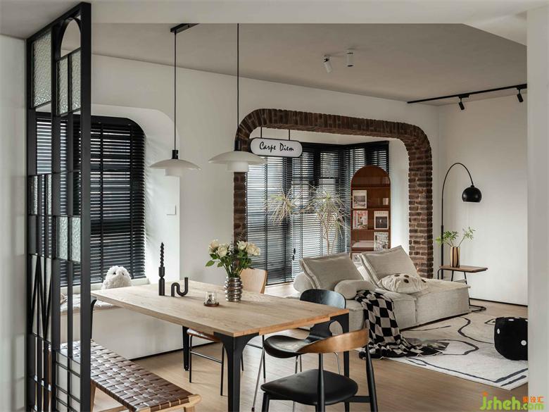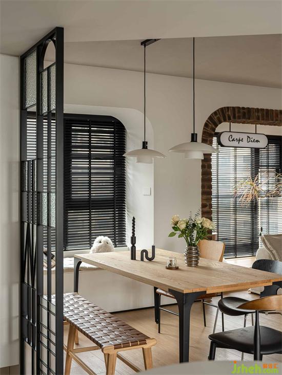 客餐區(qū)窗戶均為黑色鋁百葉,與鐵藝屏風(fēng)形成對(duì)照,強(qiáng)調(diào)北歐風(fēng)的工業(yè)感,餐桌椅也多以黑色作為點(diǎn)綴,統(tǒng)一空間色調(diào),深圳南山東關(guān)樂尚林居家裝設(shè)計(jì)營(yíng)造和諧大氣的風(fēng)格氛圍。