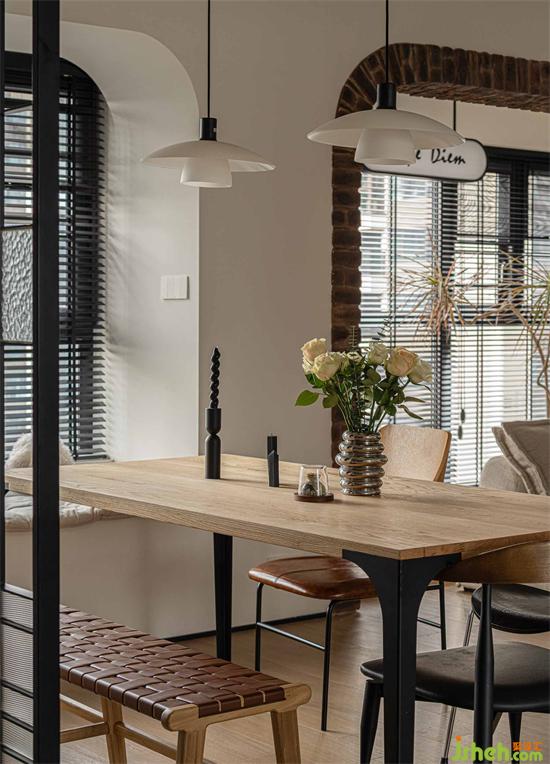 餐桌椅品類繁多,但是相互之間均有聯(lián)系,黑色鐵藝、皮質(zhì)座椅or編織坐凳、原木,這些元素構(gòu)建成餐廳面貌。
