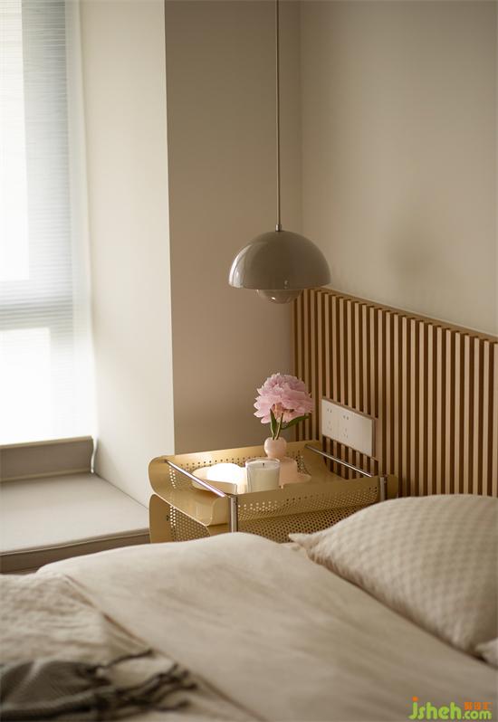 金屬質(zhì)感小推車代替笨重床頭柜。三層結(jié)構(gòu)有大有小,滿足不同的收納需求,奶杏色花苞吊燈利落而下,點(diǎn)綴床頭溫馨氛圍。