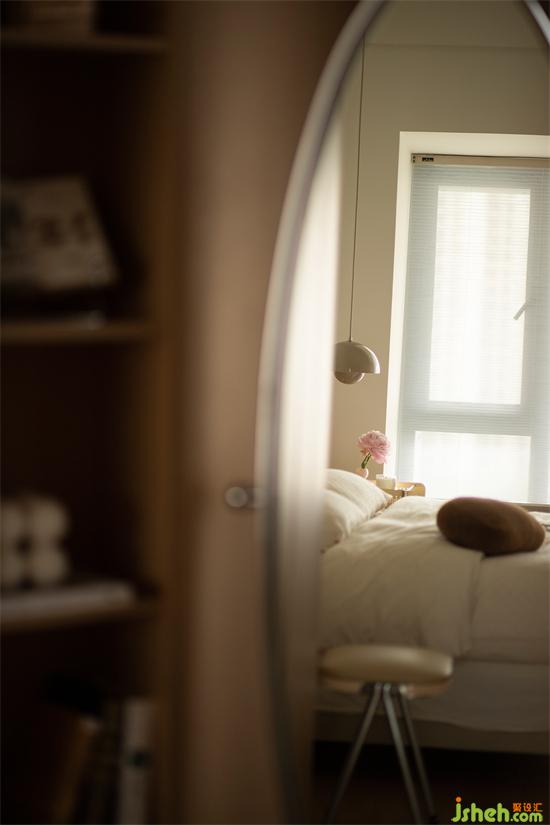 落地窗前擺放穿衣鏡和單人沙發(fā),墻角設(shè)置收納柜以及開放格,作為開放式衣帽間,或是獨(dú)立閱讀區(qū),功能豐富,生活場(chǎng)景隨意變化。