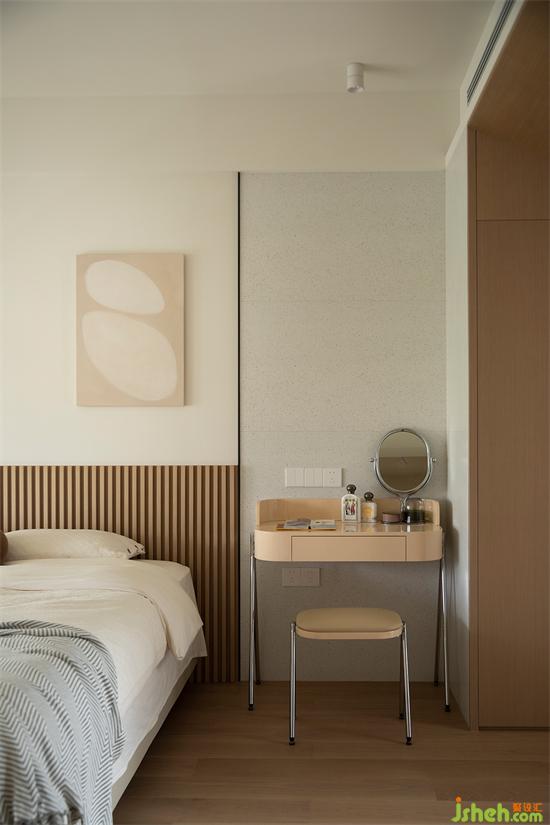 延續(xù)公區(qū)奶油色調(diào),原木的暖黃感一直貫穿其中,去床頭設(shè)計(jì)簡(jiǎn)潔大氣,半墻長(zhǎng)城板圈出床頭區(qū)域,深圳福田香格麗苑家裝設(shè)計(jì)擯棄繁雜設(shè)計(jì),卻能夠依舊保持豐富質(zhì)感。