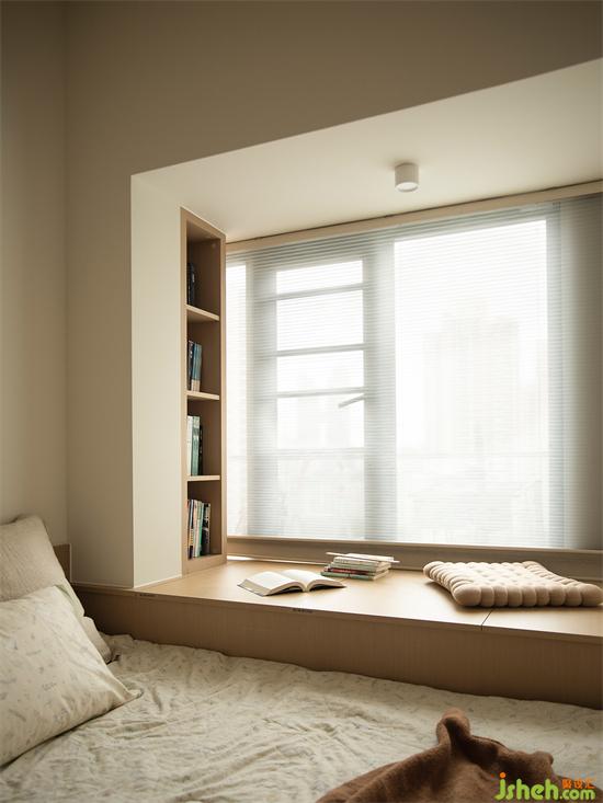 飄窗下方是收納空間,也是舒適閱讀角,墻壁打造原木開(kāi)放格,小型書(shū)柜,實(shí)用美觀。