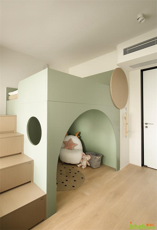 定制兒童床做成奶油綠調(diào),呼應(yīng)全屋色彩,清新活潑,符合兒童居住需求。家裝設(shè)計(jì)上面是睡眠區(qū),下方拱形內(nèi)則是獨(dú)立玩耍區(qū),給孩子城堡般娛樂(lè)體驗(yàn)。