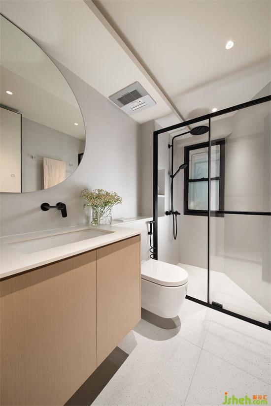 內(nèi)衛(wèi)采用灰白瓷磚通鋪,整潔統(tǒng)一,淋浴房采用下沉式設(shè)計(jì),半框玻璃隔斷,視覺(jué)清爽無(wú)比。深圳福田香格麗苑家裝設(shè)計(jì)鏡柜一直延伸至馬桶區(qū)域,拉伸空間的同時(shí),加強(qiáng)收納能力。