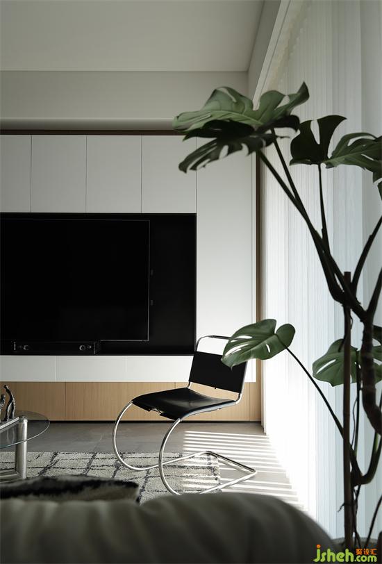 懸浮電視墻輕盈立體,柜體簡潔美觀,帶來豐富的儲物空間。深圳天健天驕裝修設計線條感單椅彰顯極簡美學,展現空間氣質,夢幻簾分割光影,加上綠植的點綴,客廳空間清透會呼吸。