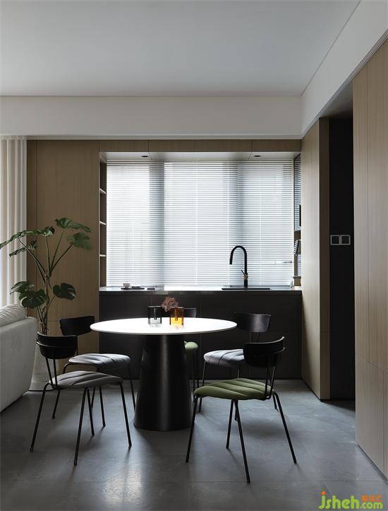 餐廳飄窗改造成水吧臺和餐邊柜功能,側(cè)邊設(shè)置開放格,深圳天健天驕裝修設(shè)計(jì)擴(kuò)展餐邊柜收納能力,安裝水槽提升日常生活便捷度。鋁百葉大氣美觀,光影下的水吧臺以及餐廳,氛圍更加柔緩愜意。