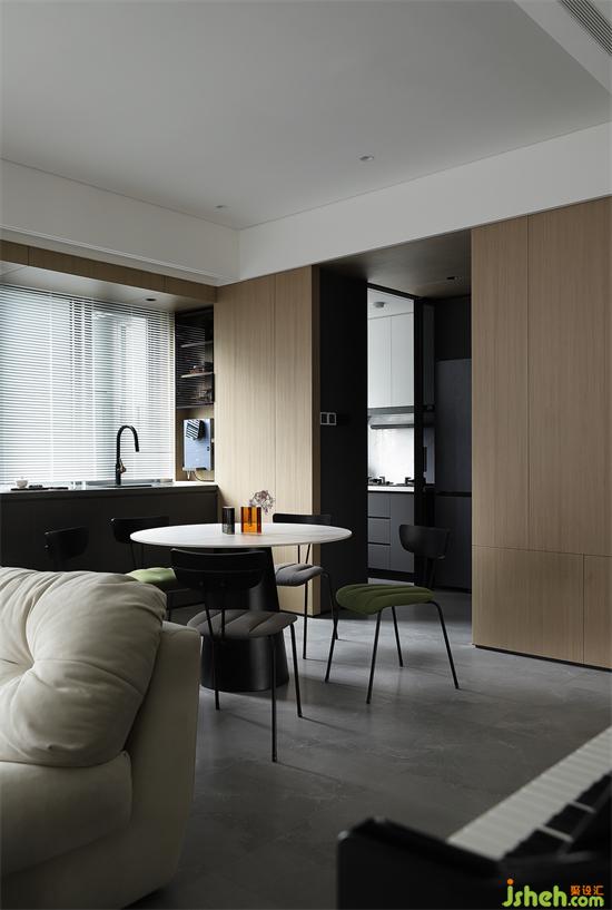 輕薄抽屜桌面懸掛在墻面,上方打造輕薄置物架,書房結(jié)構(gòu)由此展開,極簡的手法以最少形態(tài)滿足空間需求,利落且高級。
