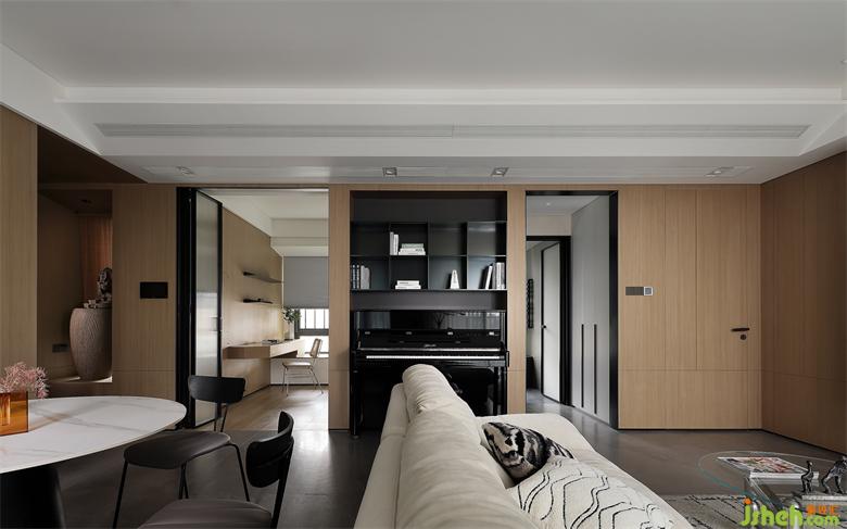 公區(qū)旁邊分布書房和兒童房,中間墻面打造成鋼琴區(qū),黑色飾面板包裹凹槽,定制一個(gè)專屬于鋼琴的“家”。深圳天健天驕裝修設(shè)計(jì)書房以玻璃折疊門隔斷,木飾面板點(diǎn)綴墻面,形成視覺延伸效果,空間無限放大。
