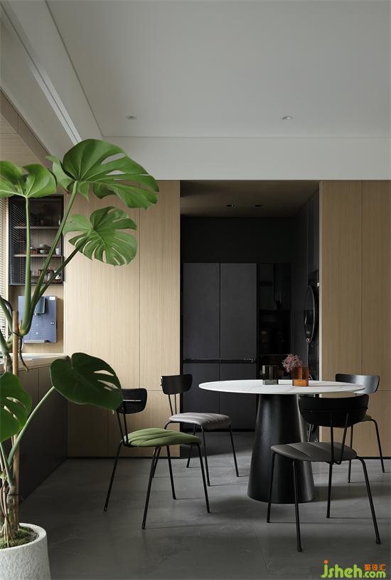 餐椅與綠植的呼應(yīng),迸發(fā)著勃勃生機(jī),細(xì)節(jié)的精妙彰顯著整個(gè)空間的氣質(zhì)。廚房空間向生活陽臺內(nèi)移,留出開放式空間放置大型家電,洗烘套組以及冰箱內(nèi)嵌其中,美觀且隱蔽,深圳天健天驕裝修設(shè)計(jì)最大限度保留公區(qū)的整潔。