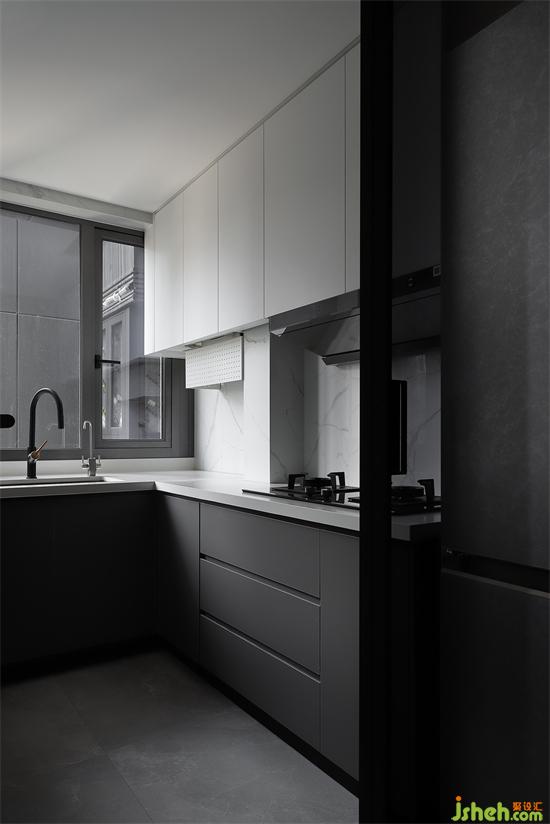 廚房采用黑玻推拉門阻隔油煙,黑白配色的櫥柜與整屋氣質(zhì)相得益彰,U型布局動線舒適便捷,廚房雖不大,但整潔清爽、采光充沛,深圳天健天驕裝修設(shè)計(jì)使用起來舒適度不會差。