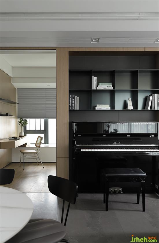 鋼琴上方打造黑色開放格,不銹鋼材質(zhì)散發(fā)精致的金屬光澤,深圳天健天驕裝修設(shè)計(jì)形成一個(gè)簡潔的書架,坐落于公區(qū)的音樂角熠熠生輝,簡潔空間中增添一絲藝術(shù)格調(diào)。