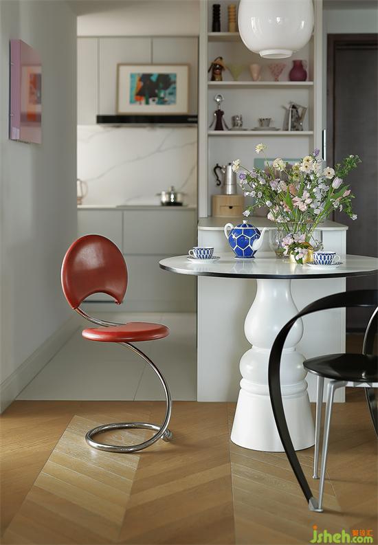 餐廳面積不大,法式公寓風(fēng)格以復(fù)古感小圓桌劃分餐廳區(qū)域,既是餐廳也是下午茶功能區(qū),完美契合法味格調(diào)。造型感餐椅藝術(shù)氛圍濃郁,線條和曲線感靈動簡約,不失品位與趣味。