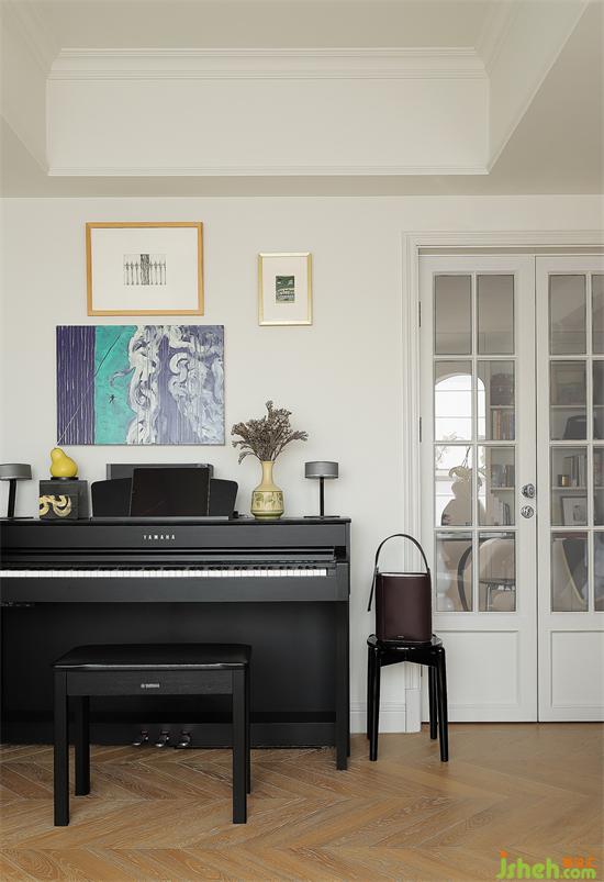 鋼琴擺放在門后角落,上方點綴上裝飾畫,融合進(jìn)整屋格調(diào),完美解決了鋼琴的安放問題,練琴環(huán)境輕松治愈。