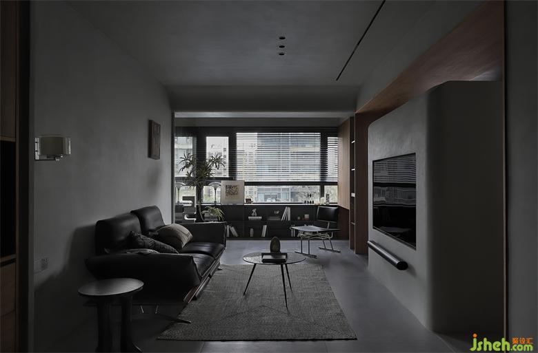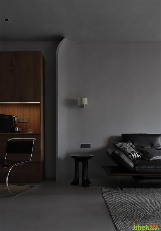 造型硬挺、座包寬大的黑色皮質(zhì)沙發(fā),給人深陷其中的云端舒適坐感,與淺灰麻色的地毯、圓幾,形成灰色調(diào)的層次漸變與疊加,看似簡約的搭配,每一處視點卻細(xì)微知著。