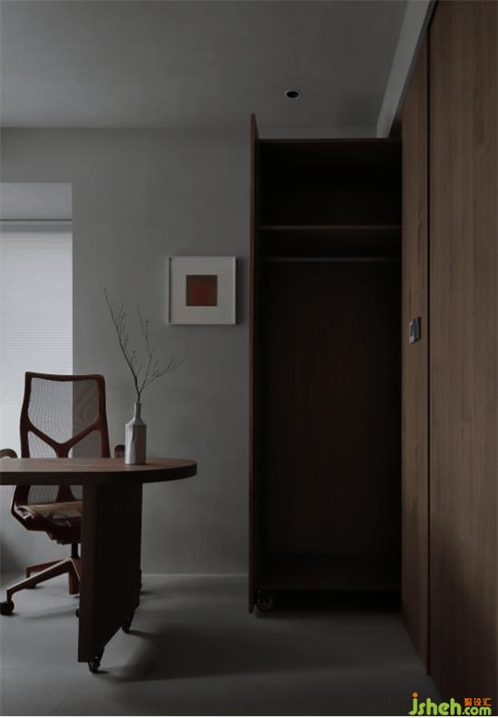 衣柜下方以黑色飾面板覆蓋,轉(zhuǎn)角延伸形成床頭柜,衣柜形成黑白分層,削減柜體的厚重感,更加輕盈美觀。