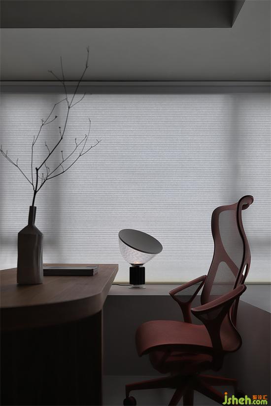 遮光簾讓光影朦朧,搭配墻面統(tǒng)一的微水泥材質(zhì),散發(fā)寧靜悠遠(yuǎn)的治愈氛圍,侘寂美學(xué)也悄然迸發(fā)。
