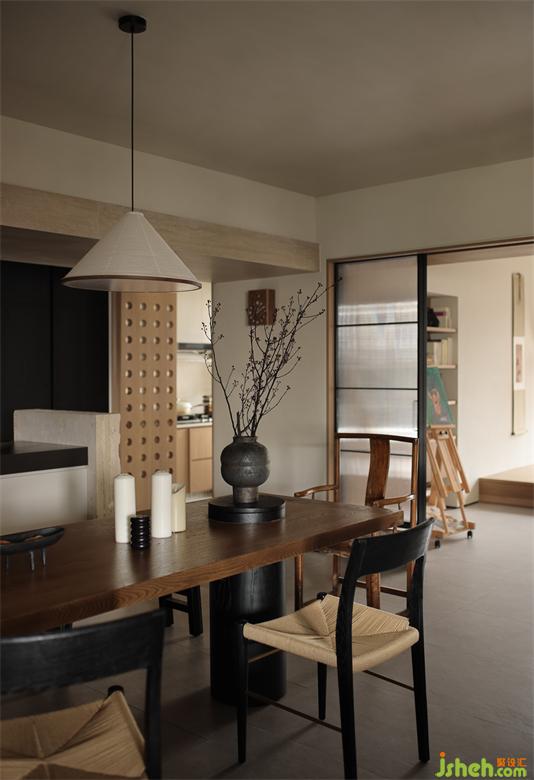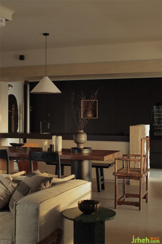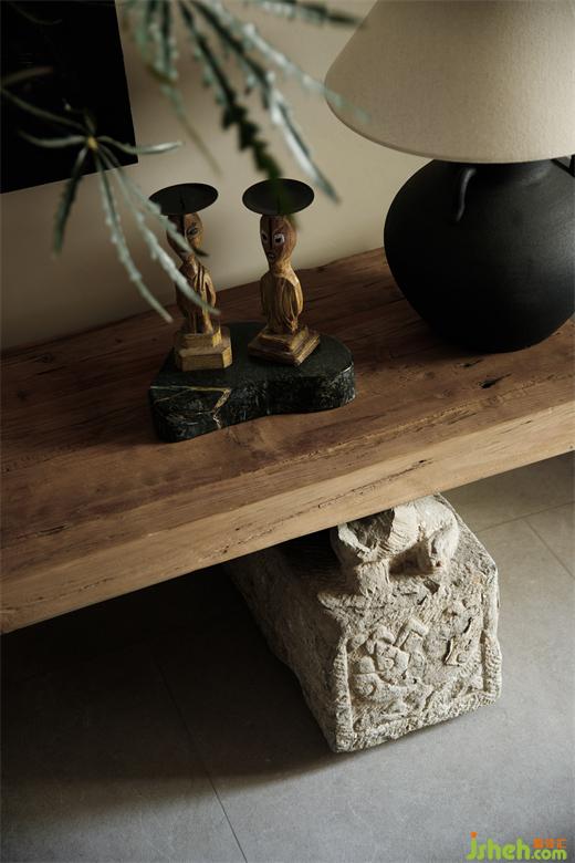 于細(xì)節(jié)上注重飾品的美學(xué)陳列,讓每處角落得以自成風(fēng)景;于是有了角落陳設(shè)的老房舊門(mén)的基石、轉(zhuǎn)角處禪意的石頭當(dāng)?shù)鬃?