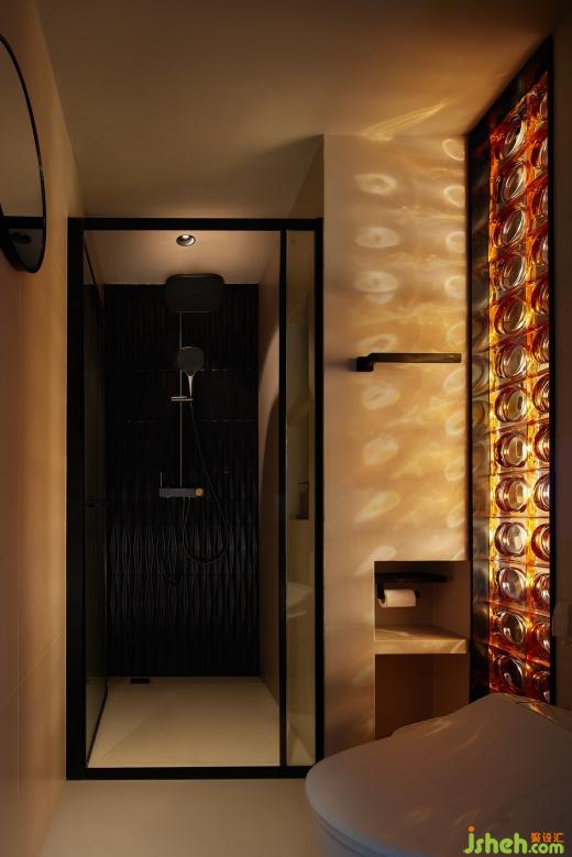 在衛(wèi)生間這片私密的天地里,玻璃磚與黃色燈光交織出一場夢幻的邂逅。玻璃磚的存在,既保證了隱私,又讓光線自由穿梭,為空間增添了一份通透與靈動。