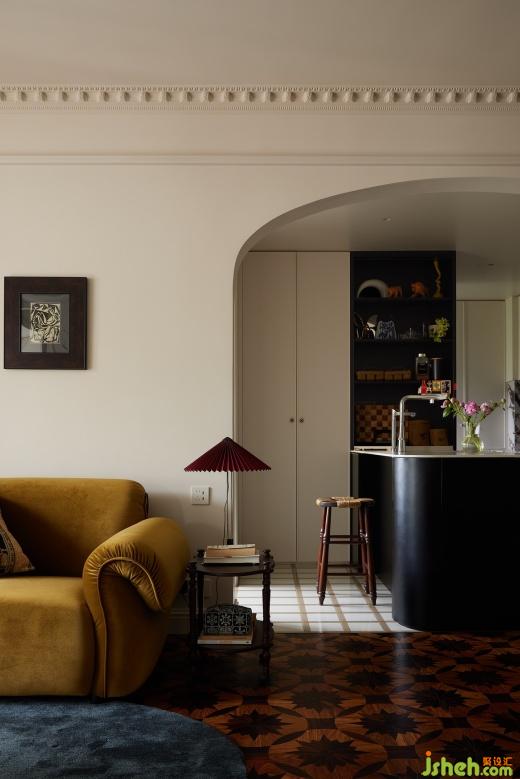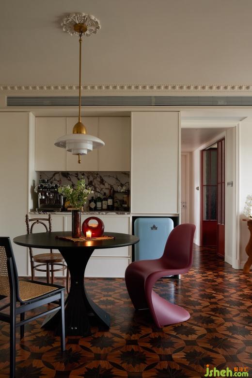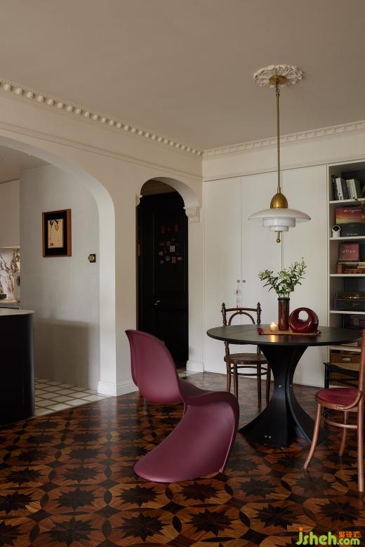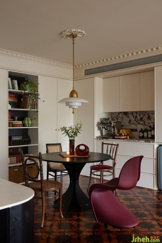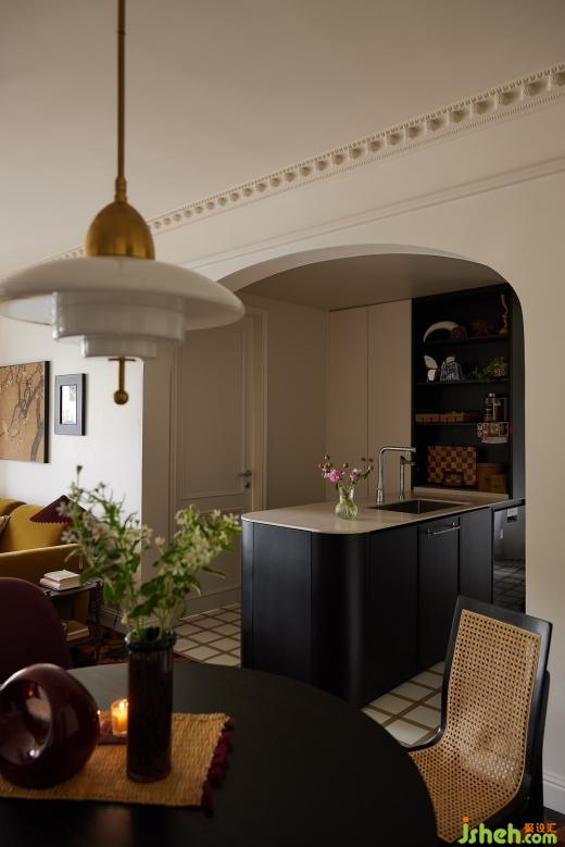 餐廳里,淺色柜體搭配黑色餐桌,在燈光的暈染下展現(xiàn)迷人魅力,帶有復(fù)古圖案和紋理的拼花地板,也為餐廳增添一份復(fù)古的韻味,燭光搖曳,絲絲縷縷地滲透進(jìn)餐廳的每一處。
