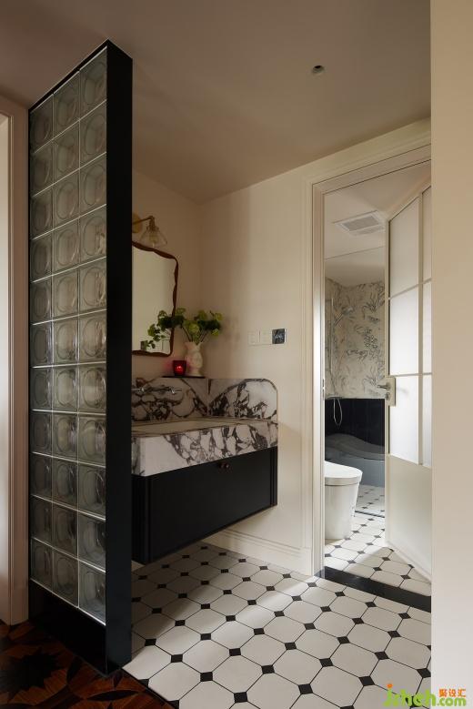 公衛(wèi)做了兩分離的布局,洗手盆外置,為了解決過道暗的情況,摒除以往實(shí)墻隔斷的做法,采用了太陽紋玻璃磚做隔斷,讓空間變得通透明亮起來,同時(shí)玻璃磚在這個(gè)空間也能起到裝飾的作用.