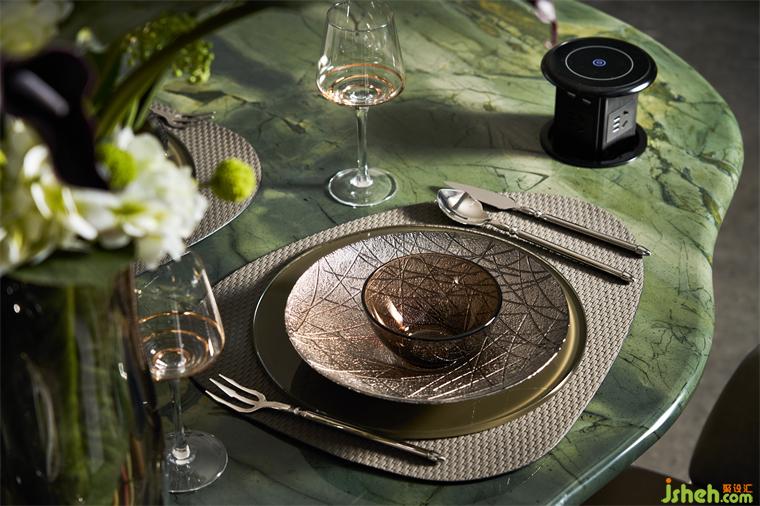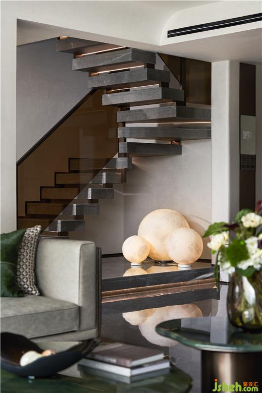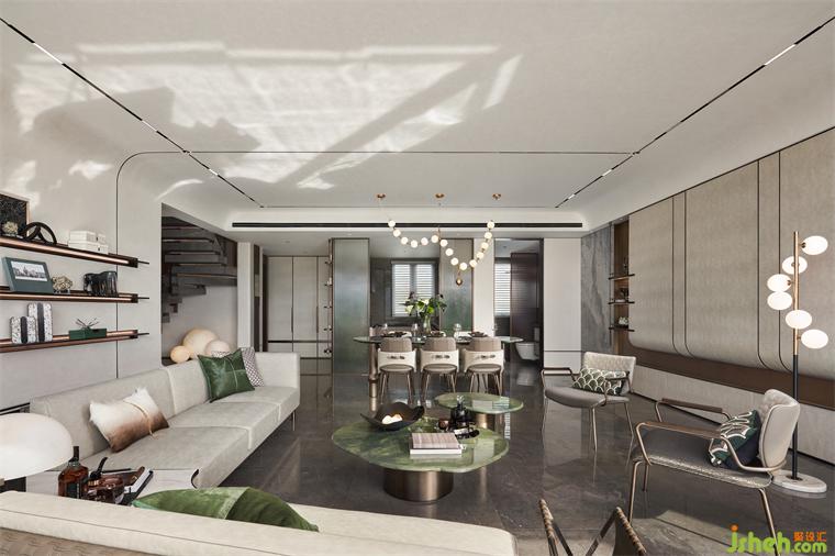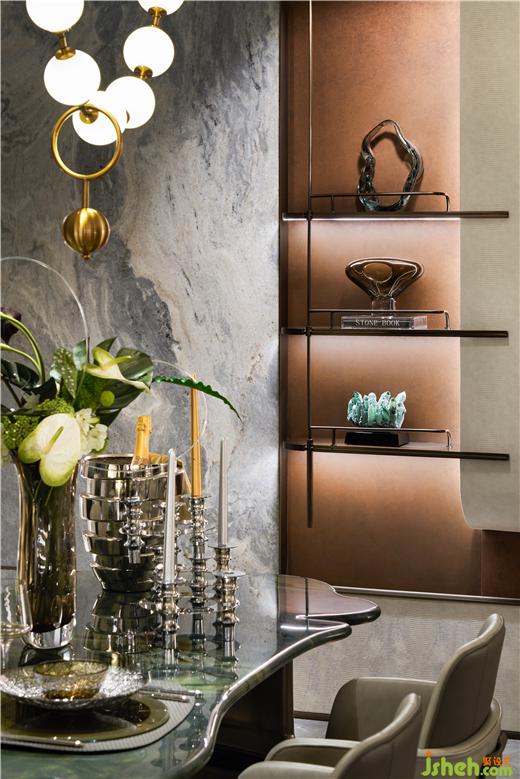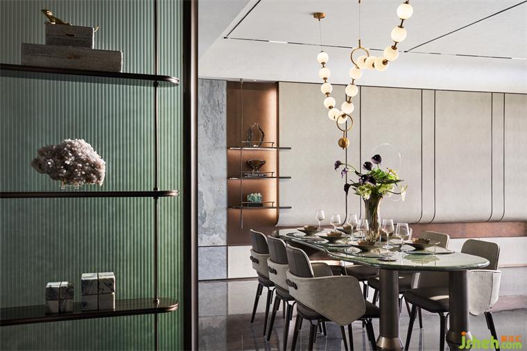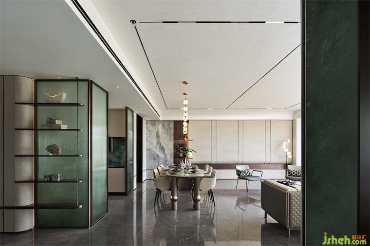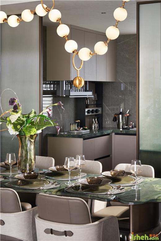 空間以灰色為主,以「瓦松綠」為點(diǎn)綴,樣板間設(shè)計(jì)帶來(lái)富有質(zhì)感的空間肌理,瓦松綠色臺(tái)面打破了環(huán)境厚重感,奢華又不失靈動(dòng)。