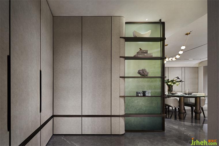 玄關(guān)延續(xù)了「瓦松綠」,不同介質(zhì)存在感不同,樣板間設(shè)計(jì)師巧妙利用材間細(xì)微差別的綠不同介質(zhì)存在感,傳遞不同的信息,營(yíng)造不一樣的氛圍。