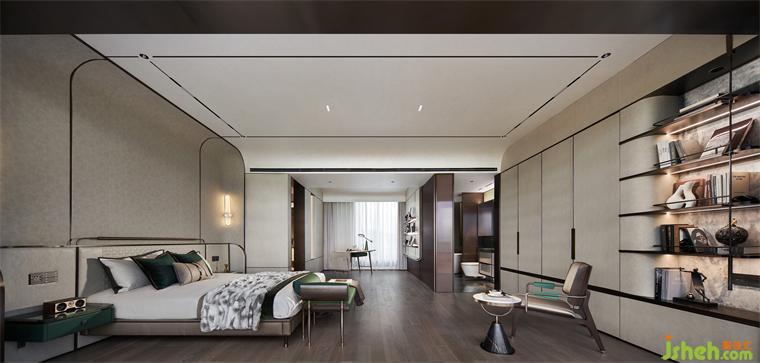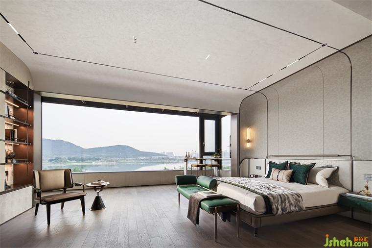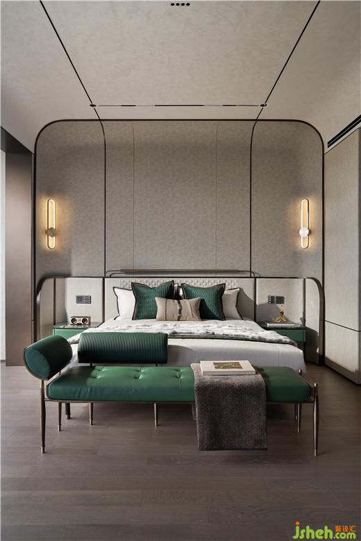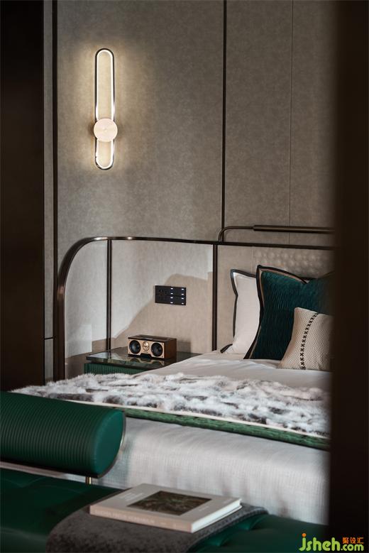 艾未設(shè)計以瓦松綠與弧形手法打造寧靜質(zhì)感的空間墻面,灰度適中,給臥室最放松的環(huán)境。