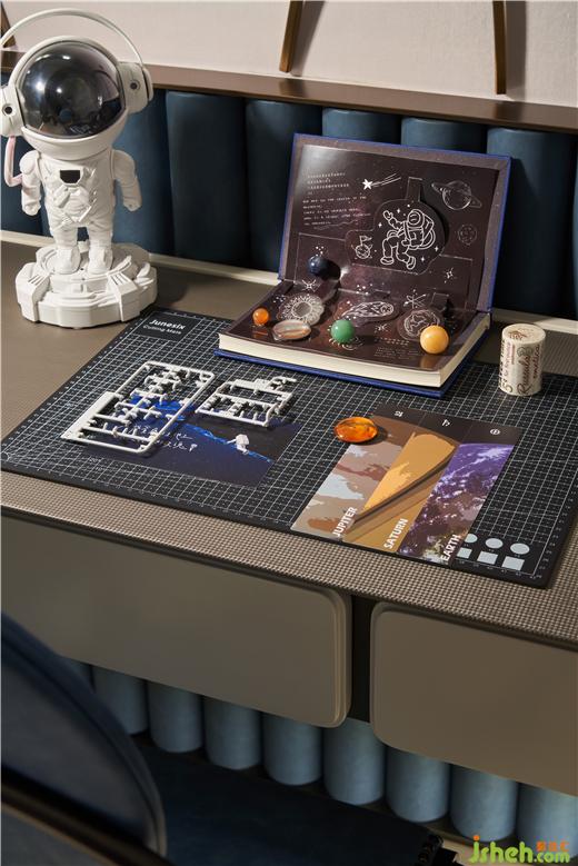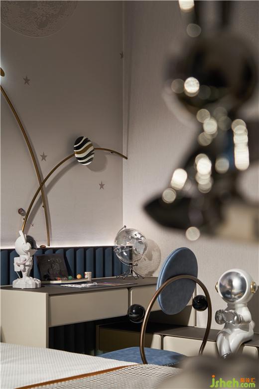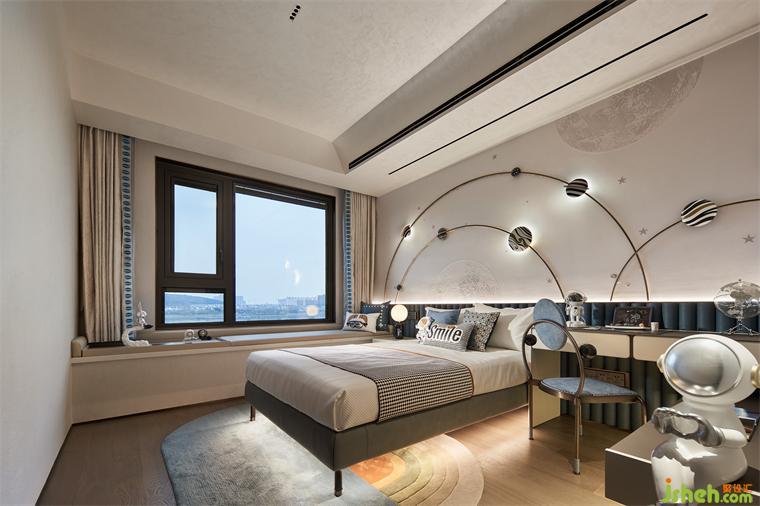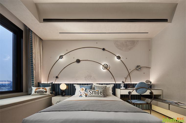兒童臥室搭配星空之藍(lán)烘托空間場域的基調(diào),樣板間設(shè)計空間采用無主燈設(shè)計,只保留了床頭墻板氛圍燈,再配上整體灰色系和暖棕色,層次分明,干凈又溫暖。