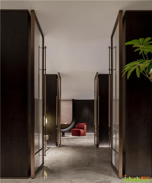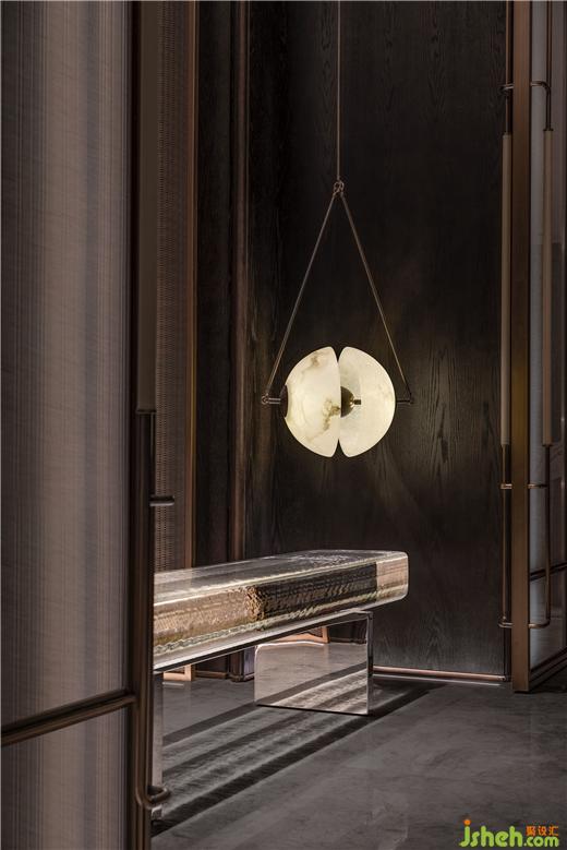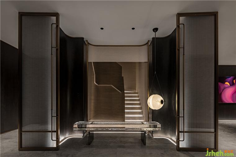 玄關(guān)似一座水晶宮殿,以四面通高的玻璃門(mén),將內(nèi)、外朦朧劃分,渲染秘境之感。每組門(mén)的開(kāi)合轉(zhuǎn)換,可實(shí)現(xiàn)不同功能區(qū)的劃分。北京半山別墅設(shè)計(jì)圍繞此而設(shè)的隱藏式儲(chǔ)物柜,旨在滿(mǎn)足居者不斷增長(zhǎng)的收納需求。金屬網(wǎng)勾勒出旋轉(zhuǎn)而上的樓梯輪廓,令人心向往之。