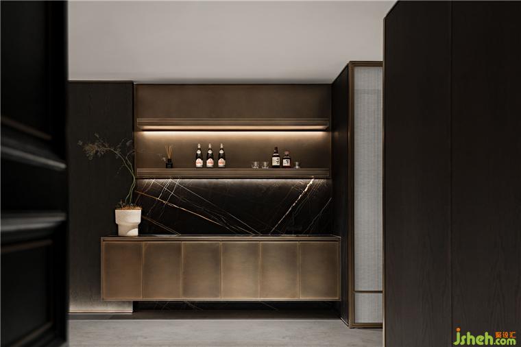 水吧臺(tái)在金屬與石材碰撞,線條和飾面交錯(cuò)間,北京半山別墅設(shè)計(jì)打造出時(shí)尚、豐富的一隅。