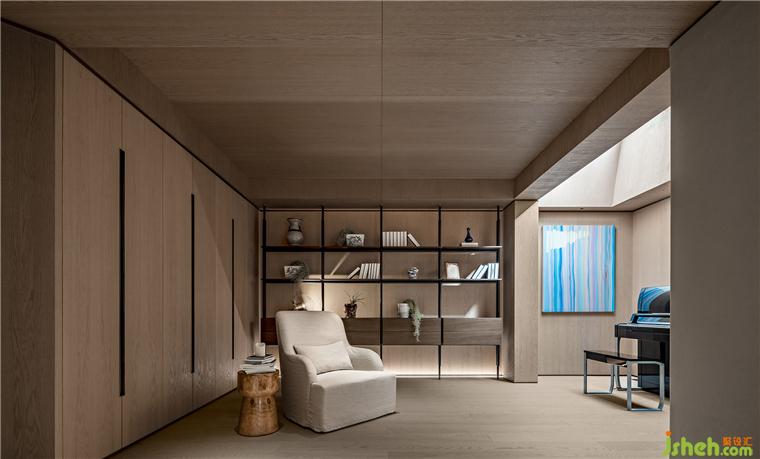 光,從天窗灑落,鋼琴仿佛披上星光點(diǎn)點(diǎn),彈奏出絕妙的樂音。懸掛的畫作《等光灑進(jìn)來》,則呼應(yīng)場域氣氛,北京半山別墅設(shè)計(jì)讓這一隅更加耀眼奪目。閱讀區(qū)作為陶冶情操的延續(xù),以借景手法與溫潤質(zhì)地,造一方優(yōu)雅恬靜。