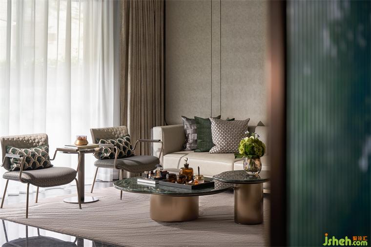 客廳簡(jiǎn)潔自然,細(xì)節(jié)靈動(dòng)。沙發(fā)背景以柔和轉(zhuǎn)折的特點(diǎn),表現(xiàn)內(nèi)斂含蓄之美,角落嵌鋼的開放式展架,打破平淡之余,強(qiáng)調(diào)高雅舒適的格調(diào)。地毯的紋理模擬水的流動(dòng)形態(tài),為這處小生態(tài)增添一絲趣味。
