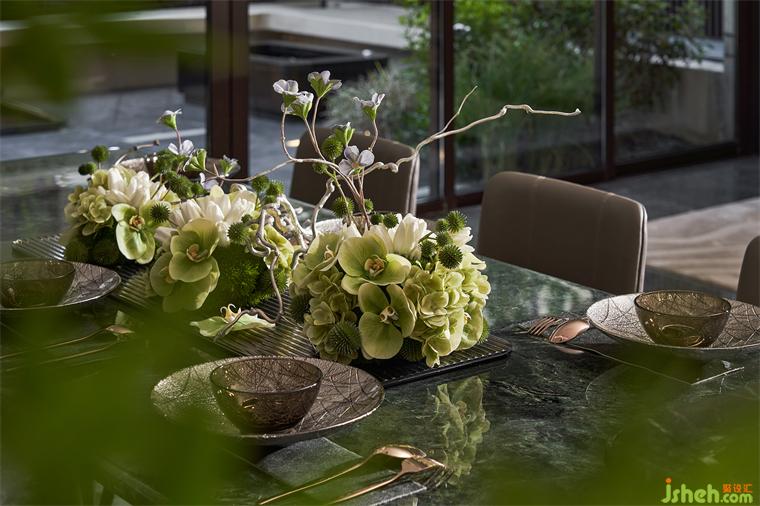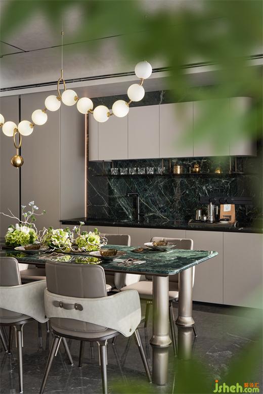 中西廚臺面及墻面以貓眼綠石材鋪就,讓生機(jī)盎然的“綠”蔓延至各處,也構(gòu)筑起居者自然、健康、開闊的生活居所。