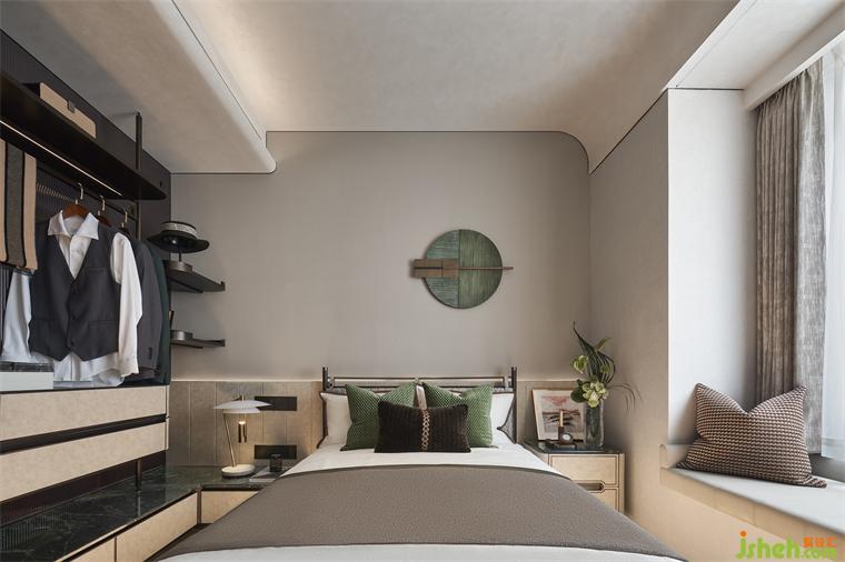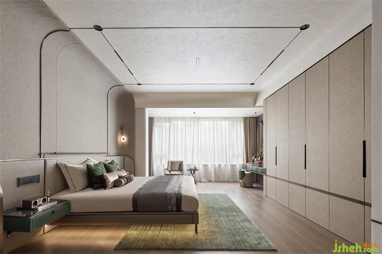 主臥置于二層,由始至終的儀式感貫穿其中,進(jìn)門展示層架與弧形手法呈現(xiàn)的床背,勾勒出豐潤舒暢的狀態(tài),材質(zhì)紋理突出,在灰度適中的燈光渲染下,簡約而不失格調(diào),樣板間設(shè)計(jì)以涓涓細(xì)流匯聚生活詩意。