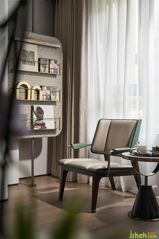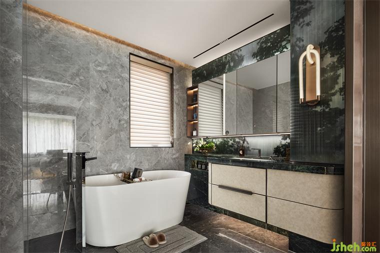 主衛(wèi)也依然不乏自然與生機(jī),貓眼石沿用于此,搭配綠色夾絲玻璃,樣板間設(shè)計(jì)將“綠”進(jìn)行到底,更添一絲靈動愜意。