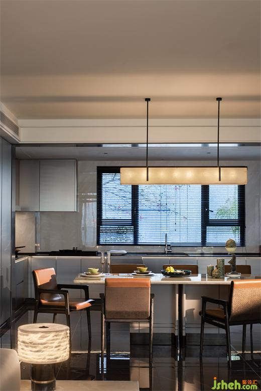 L型廚房和餐廳的等寬設置,基于人體工學的考量,以開放格局響應便捷服務。框景手法取戶外景觀入室,讓綠色為餐廳注入靈動之美,愜意陪伴一日三餐。